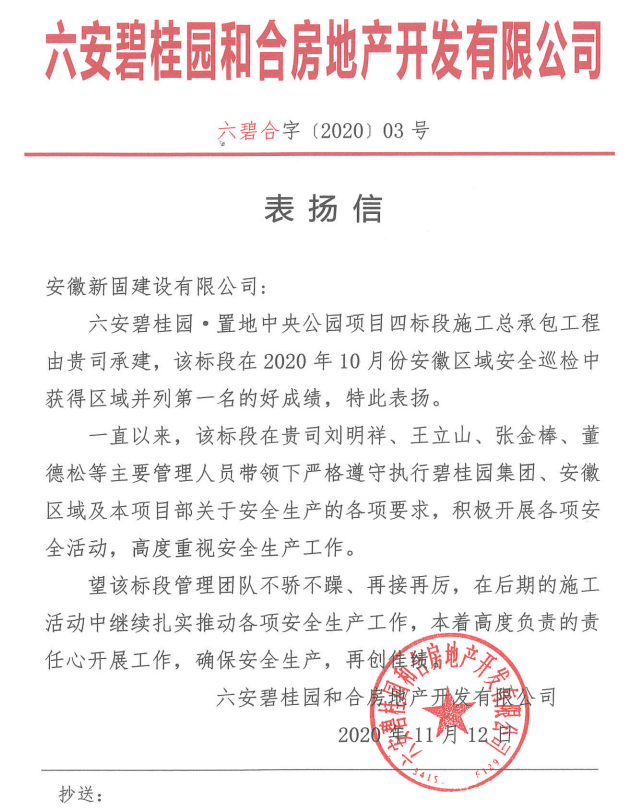 2020年10月份,該標段在碧桂園安徽區(qū)域安全巡檢中獲得區(qū)域并列第一名的好成績。