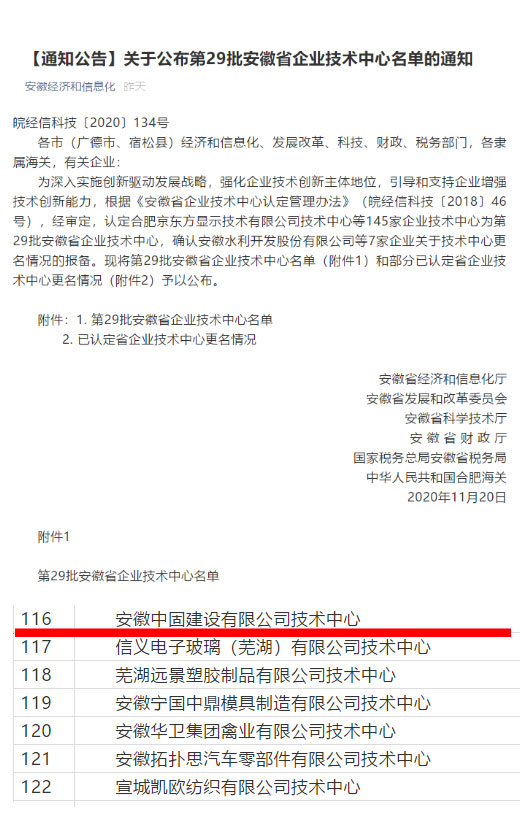 為推進以企業(yè)為主體的技術(shù)創(chuàng)新體系建設(shè),增強企業(yè)創(chuàng)新能力,經(jīng)公司多年努力,安徽中固建設(shè)有限公司企業(yè)技術(shù)中心通過2020年第29批“安徽省企業(yè)技術(shù)中心”認定。