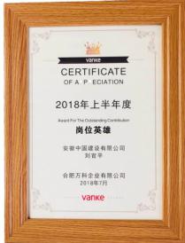 愛崗敬業(yè)結(jié)碩果!中固人劉官平、王明兩位員工,榮獲合肥萬科企業(yè)有限公司2018年上半年度“崗位英雄獎”。