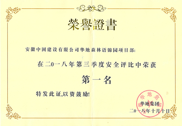 近日,安徽中固建設(shè)有限公司?華地森林語錦園項(xiàng)目以總分96.4分的高分,榮獲華地集團(tuán)2018年三季度“安全競(jìng)賽評(píng)比活動(dòng)”第一名。