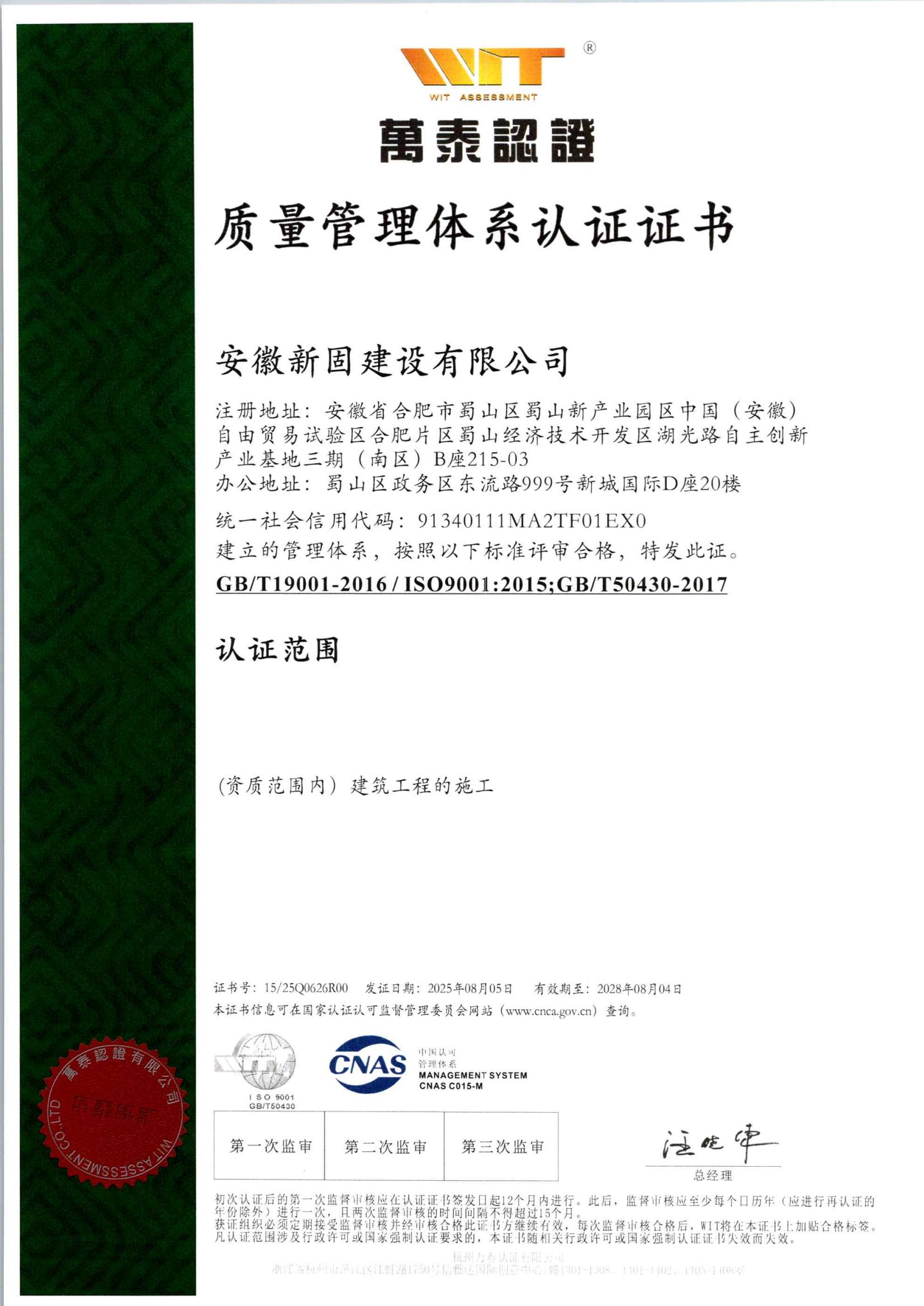 安徽新固獲“質(zhì)量管理體系認(rèn)證”證書