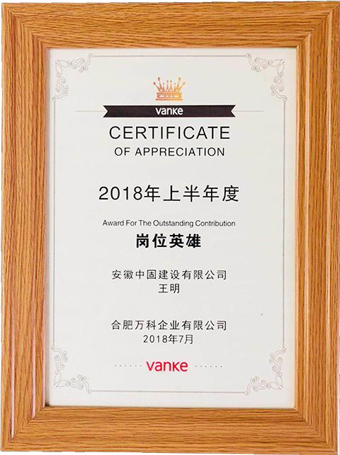 愛崗敬業(yè)結(jié)碩果!中固人劉官平、王明兩位員工,榮獲合肥萬科企業(yè)有限公司2018年上半年度“崗位英雄獎”。