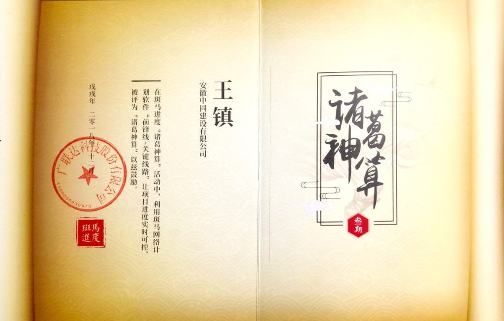 2019年1月11日,他代表公司參加廣聯(lián)達(dá)科技股份有限公司舉辦的“諸葛神算”活動(dòng),使用了“前鋒線+關(guān)鍵線路”這一應(yīng)用,為項(xiàng)目進(jìn)度糾偏提供技術(shù)支持,榮獲了“進(jìn)度管控優(yōu)秀項(xiàng)目”獎(jiǎng)。